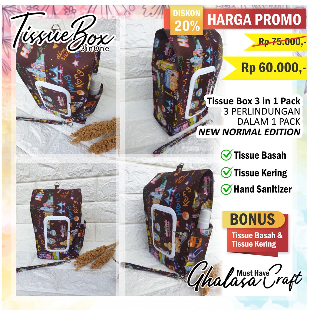 pouch / tempat tissue (handmade) anti virus 3 in 1, beragam motif pilihan siap menemani hari-hari ceria mu, tetep fashionable, mudah dibawa kemana2 dan pastinya ga bikin tisu basah jadi cepet kering...Stock ready di store, siap kirim ke seluruh Indonesia.NOTE : PEMBELIAN SUDAH TERMASUK BONUS ISI TISSUE BASAH DAN TISSUE KERING*) anti ribet ribet club dah... beli, bisa langsung dipakai, siap dibawa kemanapun tanpa harus ribet beli isi nya :)Spesifikasi :Tersedia beragam motifBisa untuk 2 tissu sekaligus + handsanitizer di sisi samping pouch. Bagian depan untuk tissu basah dan bagian belakang untuk Tissu kering.Tutup bagian depan fliptop dan resleting di bagian belakang untuk tissu kering maupun Refill.Bahan waterproof, tissue basah aman anti rembes anti kering1 kg bisa muat 2 pcs (sudah include tissue basah dan tissue kering)Packing dilapis bubblewrapHappy Shopping! ^_^#pouch#pouchtissue#tempattisu#wettissuepouch#Handmade#tissuebox#pouchkosmetik#pouch3in1#tissuebasah#tempattissue#tissuepouch#pouchhan
