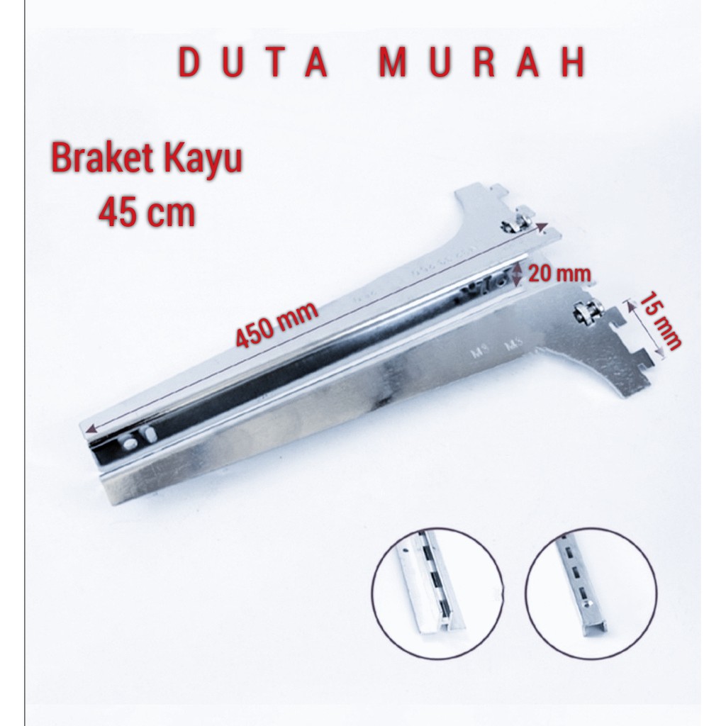 Bracket KayuUkuran : 45 cmBahan : Besi ChromeHarga : Per set (Kanan & Kiri)Kualitas di jamin Bagus dan Awet.# Barang yang masih bisa di pesan berarti ready ya kak.Terima kasihmohon untuk komplain sertakan bukti vidio unboxing paket,maaf komplain tanpa bukti kami tidak bisa p
