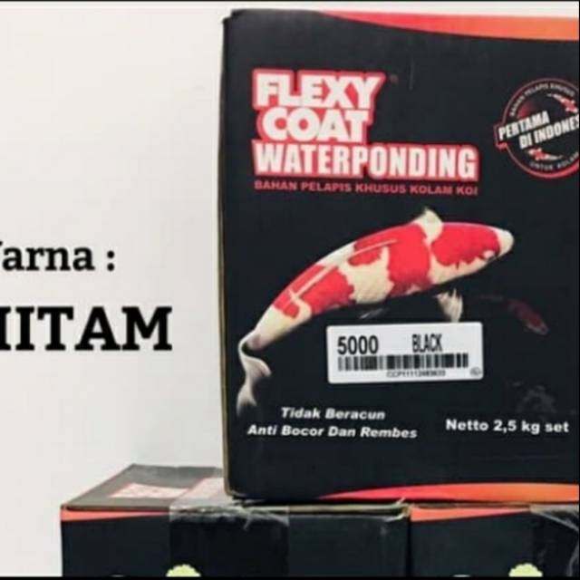 Merk : FLEXY COAT WATERPONDINGWarna : Hitam1. Berat : 2,5kg/set2. Perbandingan Cairan dan powder : 1 : 1,5daya Sebar 2,5kg = 4meter persegi3. Minimal 2x Pelapisan untuk permukaan yang sudah diaci4. Minimal 3x Pelapisan Untuk Permukaan yang belum atau tidak diaci5. Waktu Pengeringan antar lapisan : 30-45menit6. Waktu Kering Sempurna Minimum 7 hari7. Waktu Simpan : 1jam setelah bahan tercampurKeterangan :FLEXY COAT WATERPONDING adalah Bahan Pelapis yang terdiri dari 2 komponen ( cairan dan powder ) , diformulasikan dengan menggunakan polimer khusus dan bahan tambahan lainnya untuk menghasilkan aplikasi yang tahan bocor , elastis dan tidak mudah retak serta memiliki daya lekat tinggi pada berbagai permukaan substrat.Tersedia warna hitam dan biruTersedia ukuran 2,5kg untuk 4meter persegi dan 10kg untuk 16meter pe