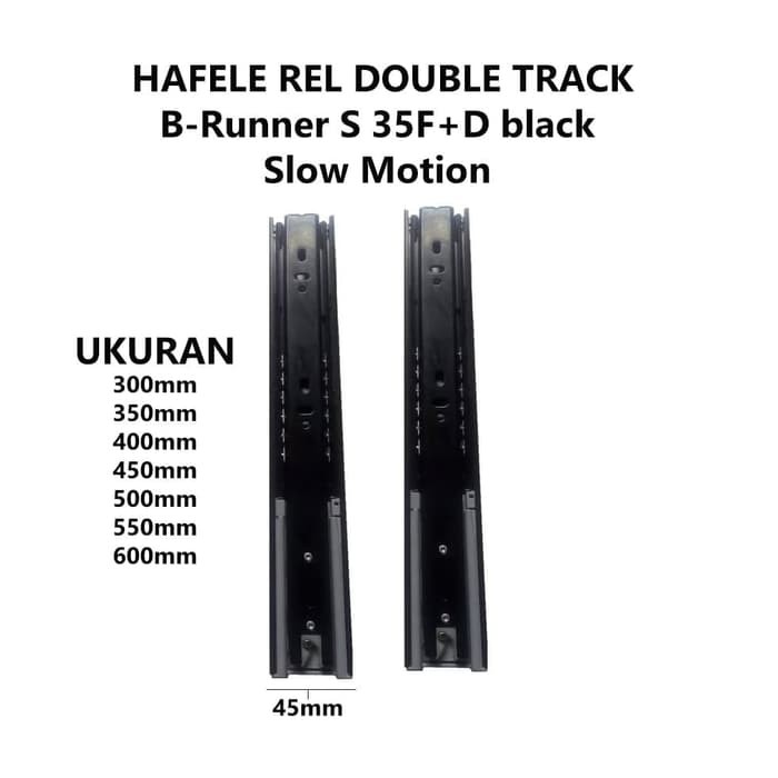 REL LACI DOUBLE TRACK 45CM / HAFELE REL LACI BB SLOW MOTION 432.24.384REL LACI DOUBLE TRACK BALL BEARING SLOW MOTION : DAPAT MENUTUP DENGAN SENDIRINYA.HAFELE REL DOUBLE TRACK B-Runner S 35F+D black 450mm 432.24.384MEREK : HAFELEUKURAN LEBAR : 45MMHARGA / P