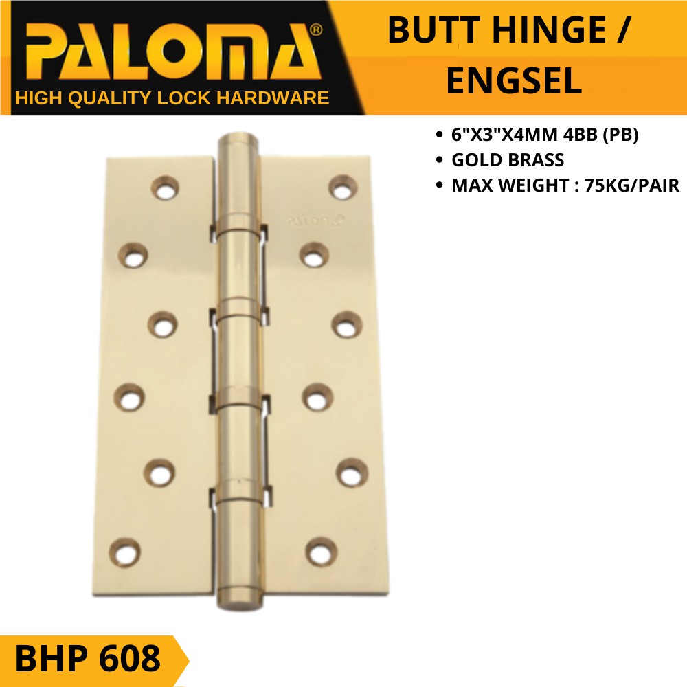 Name: Paloma Bhp 608 Butt Hinge Engsel Pintu 6"x3"x4mm 4bb Pb Brass Gold Emas Pb