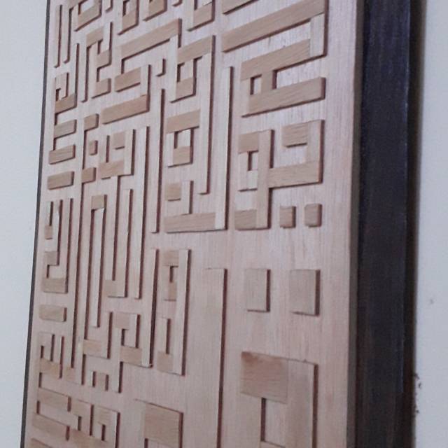 Kaligrafi kufi al-ikhlas huruf timbul. Produksi sendiri dari bahan plywood dan pelapis pvc sheet serta topcoat clear gloss_bukan poster, sehingga memberi kesan mewah dan elegan. Cocok dipasang di ruang kerja atau ruang